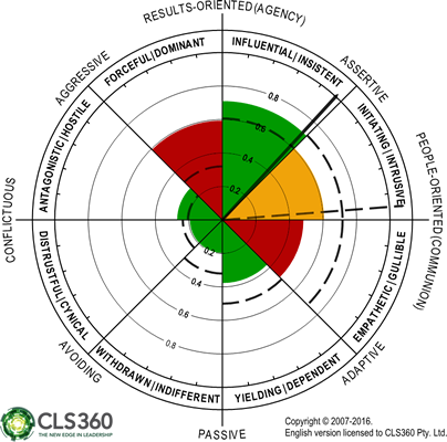 A defining feature of the CBS360 is the arrow or vector, which represents the direction and strength of the individual's use of all eight styles combined. The vector tells a lot about an individual's overall behavioural repertoire and flexibility to use these behaviours. The vector indicates the overall interpersonal style as represented in the two-dimensional space of Agency, the vertical axis, and Communion, the horizontal axis.